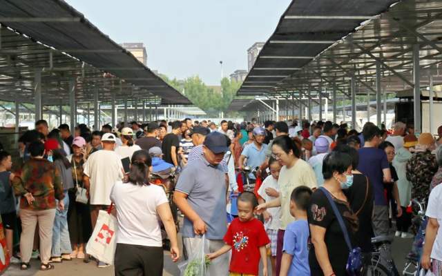 集市里,摊贩们的叫卖声和居民询问的声音交杂着,热闹中,散发着热气腾腾的烟火气。